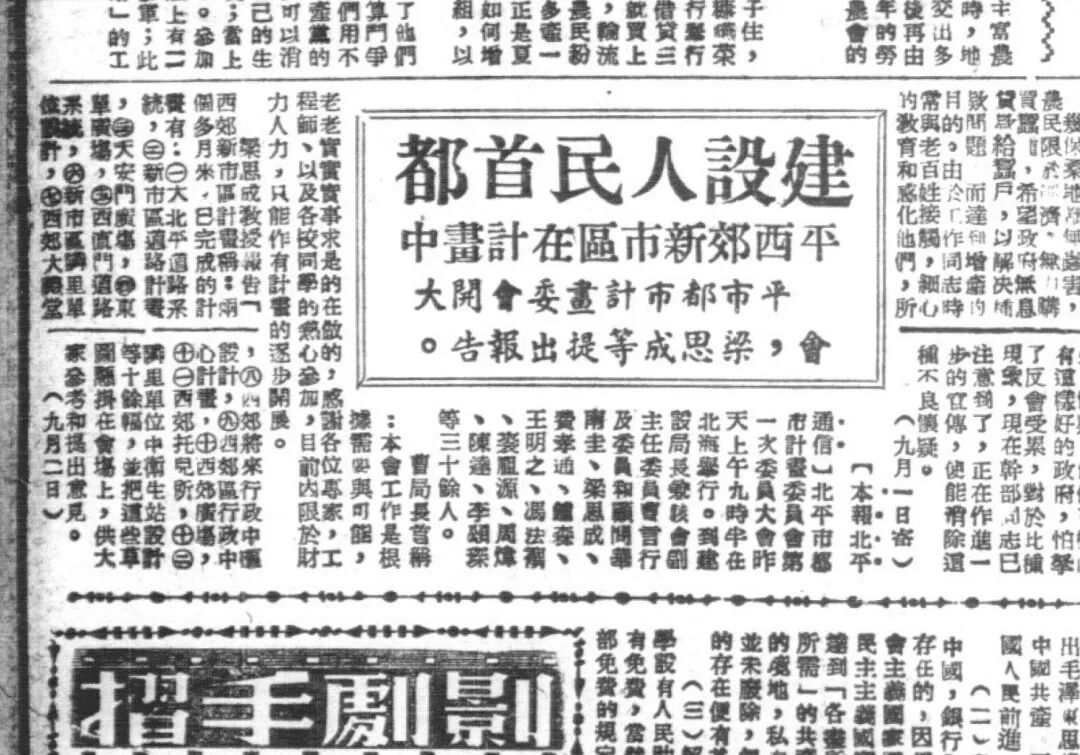 香港《大公报》1949年9月15日刊发的关于北平西郊新市区计画进展的消息,“北平市都市计画委员会第一次委员大会昨天上午九时半在北海举行。到建设局长兼该会副主任委员曹言行及委员和顾问华南圭、梁思成、费孝通、钟森、王明之、冯法禩、裘祖源、周炜、陈达、李颂琛等三十余人”,“梁思成教授报告西郊新市区计画称:两个多月来,已完成的计画有:㈠大北平道路系统,㈡新市区道路计画,㈢天安门广场,㈣东单广场,㈤西直门道路系统,㈥新市区邻里单位设计,㈦西郊大礼堂,㈧西郊将来行政中枢设计,㈨西郊区行政中心计画,㈩西郊广场,㈩㈠西郊托儿所,㈩㈡邻里单位中卫生站设计等十余幅,并把这些草图悬挂在会场上,供大家参考和提出意见”