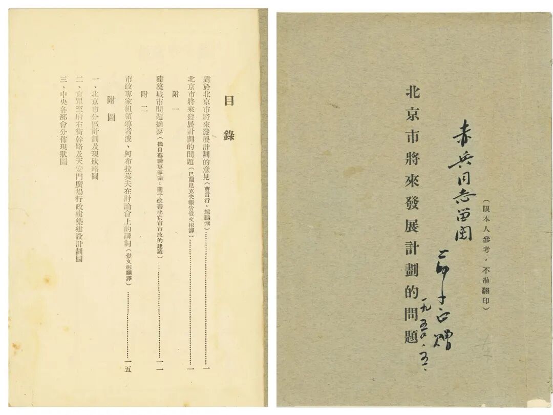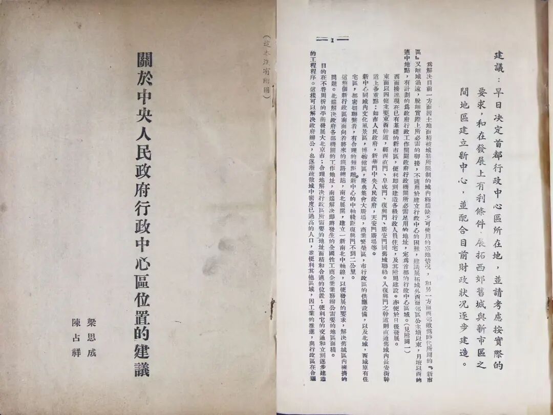 梁思成和陈占祥联名提出《关于中央人民政府行政中心区位置的建议》(《梁陈建议》)封面(右)和正文首页(1950年2月)