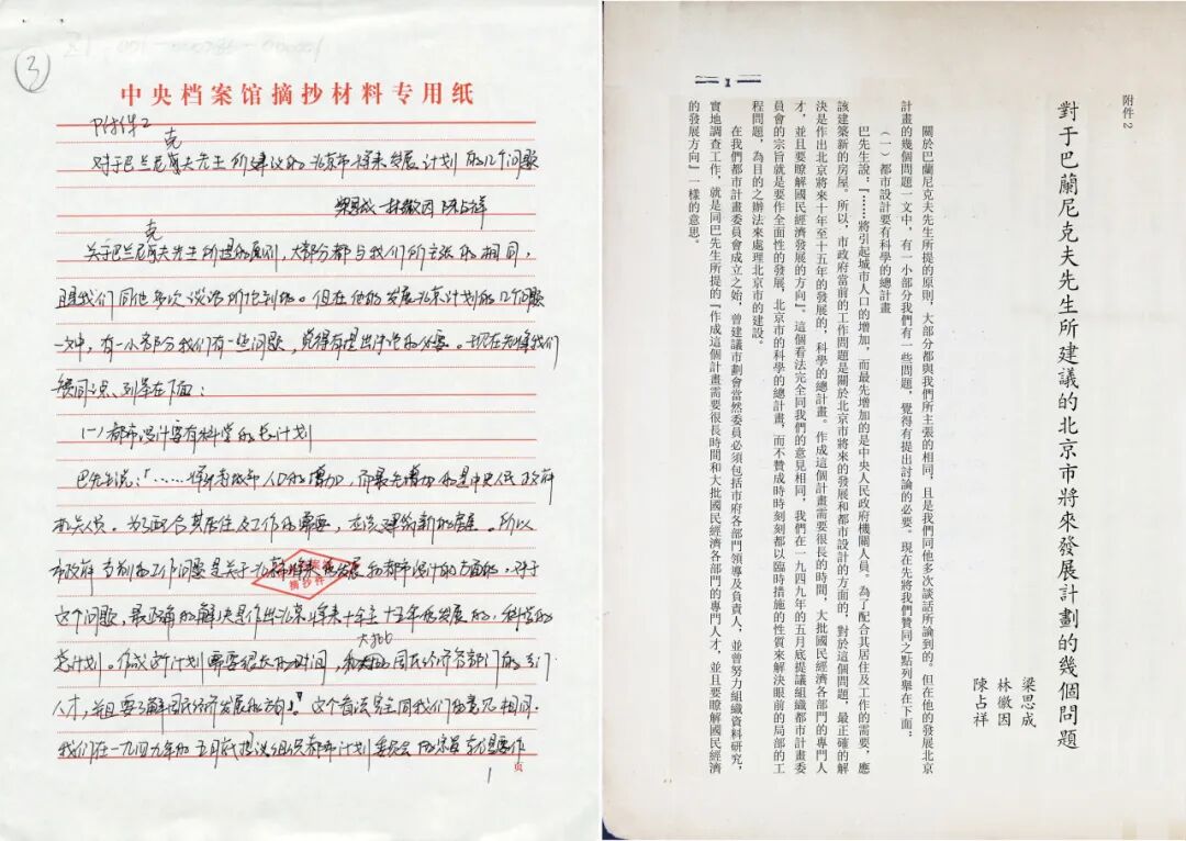 《梁陈建议》附件1:梁思成、林徽因和陈占祥合著《对于巴兰尼克夫先生所建议的北京市将来发展计划的几个问题》手抄件首页(左)及根据查档记忆复原版式(右)