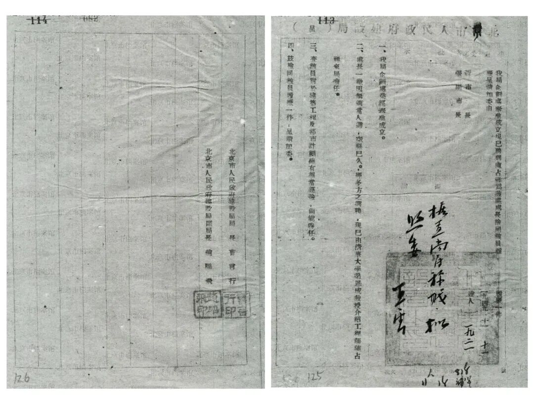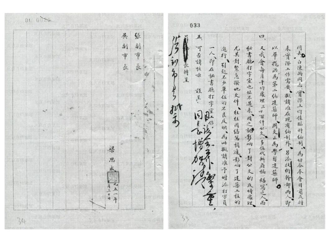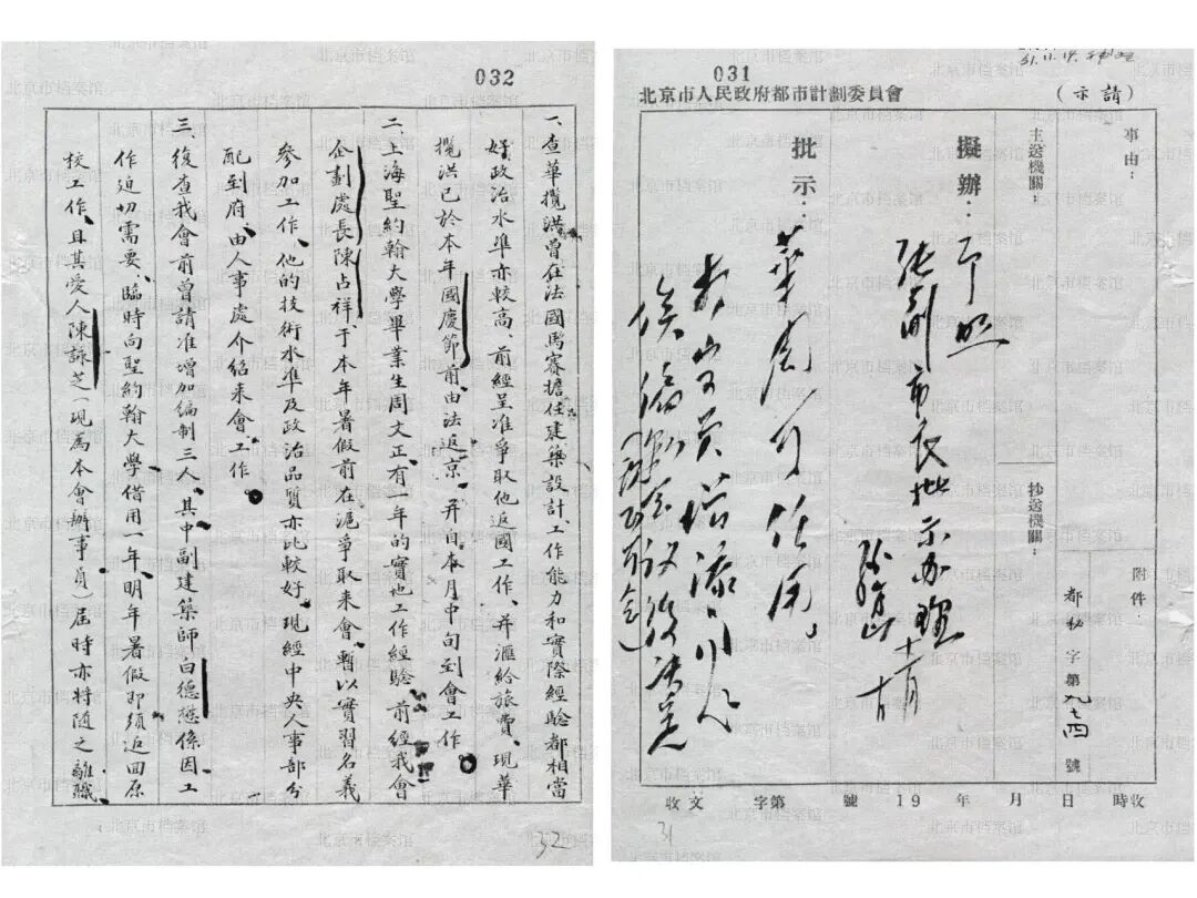 梁思成起草、经北京市人民政府秘书长薛子正转呈张友渔和吴晗两位副市长的一份关于邀聘华揽洪等专家的请示报告(1951年10月30日),接到这份请示后,薛子正圈阅:“因该会工作繁重,同意增加,请张副市长批示”,张友渔副市长批示:“华[揽洪]、周[文正]可任用,打字员增添问题,俟编制会议后决定(现正开会)”。