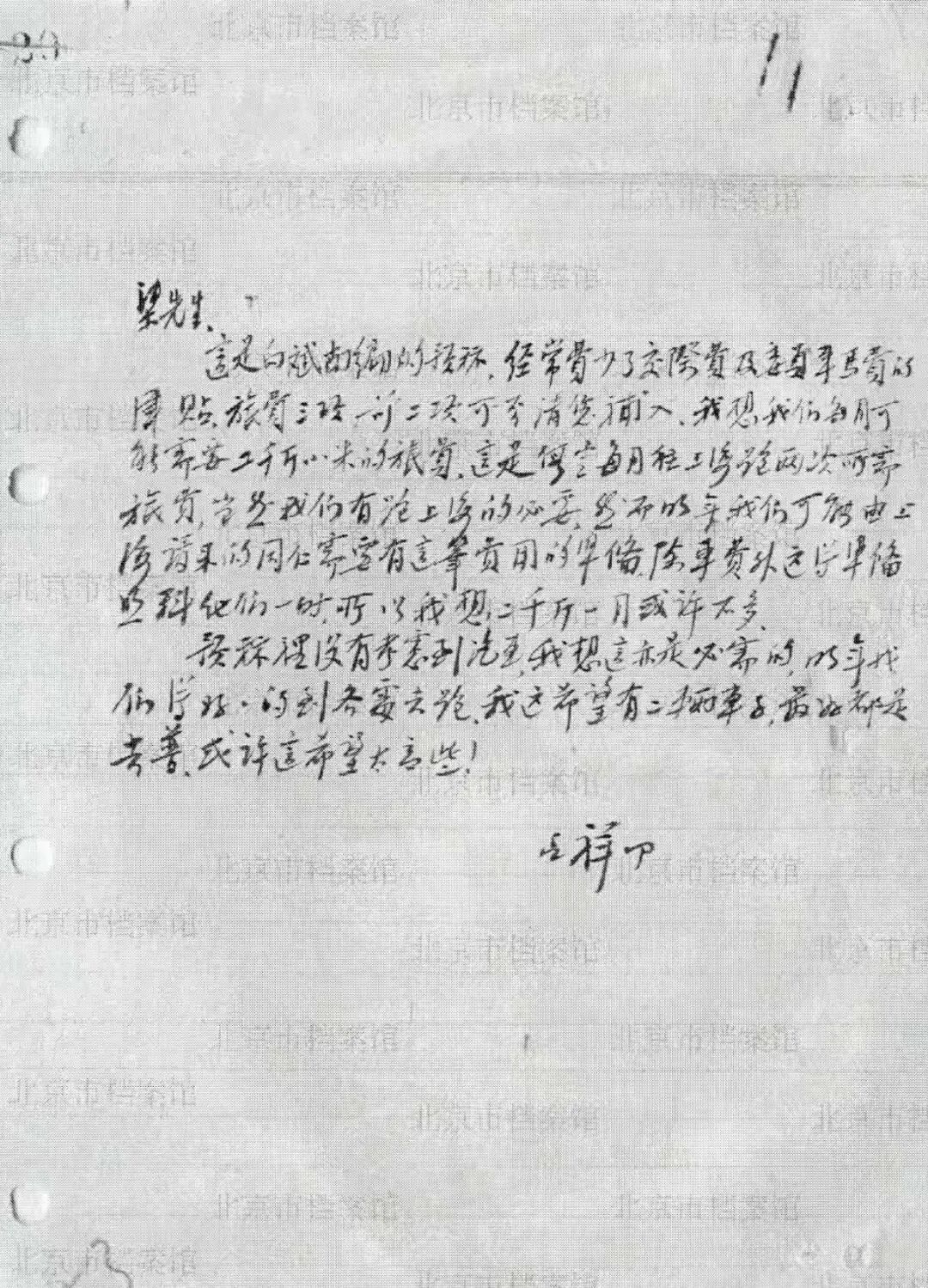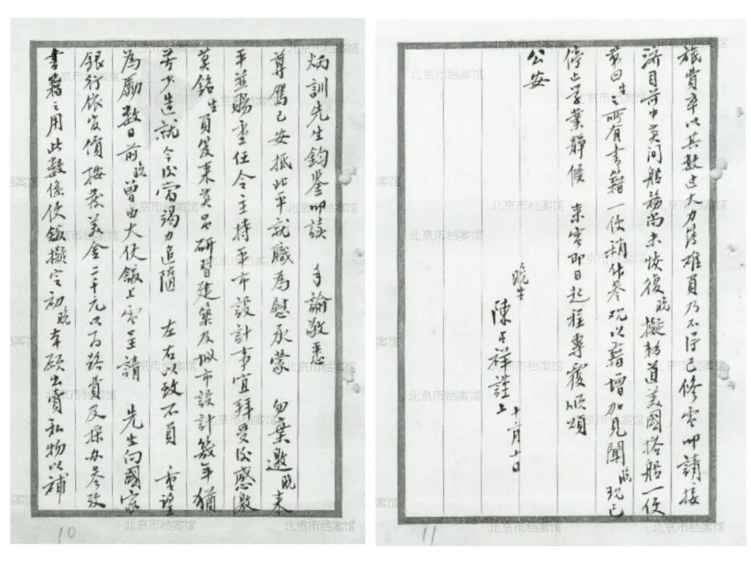 叩读手谕,敬悉尊驾已安抵北平就职为慰,承蒙勿弃,邀晚来平并赐重任,令持平市设计事宜,拜受后感激莫铭。生负笈来英虽研习建筑及城市设计几年,犹苦少造就,今后当竭力追随左右,以致不负重望为励。