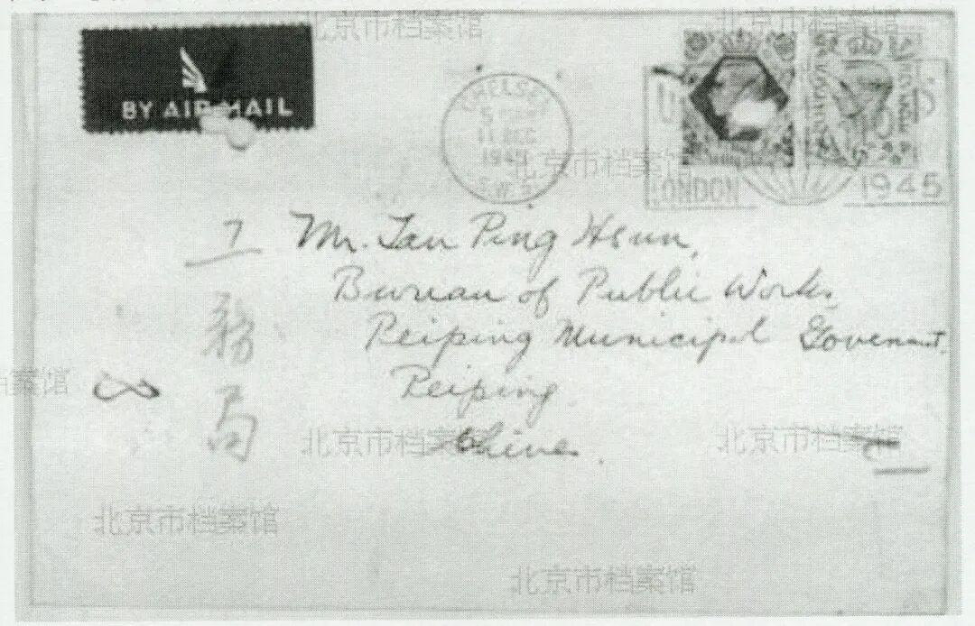 1945年北平市工务局局长谭炳训向陈占祥发出关于回国主持“大北平计划”的邀请后,陈占祥于12月10日以航空邮件发出的回信(信封)